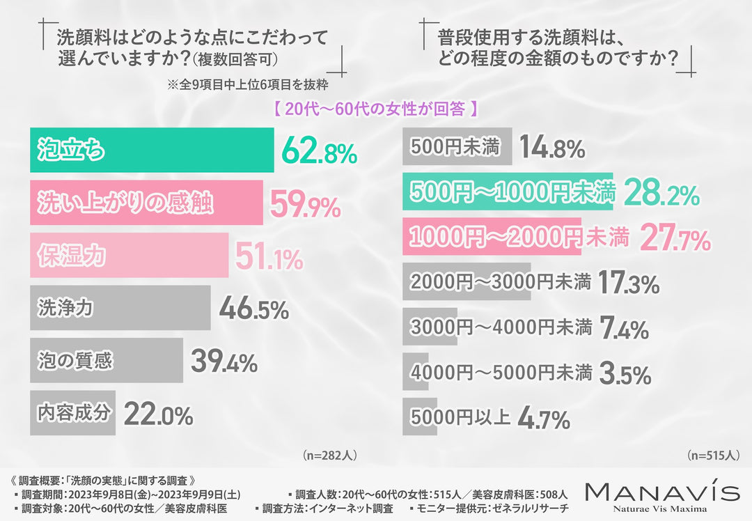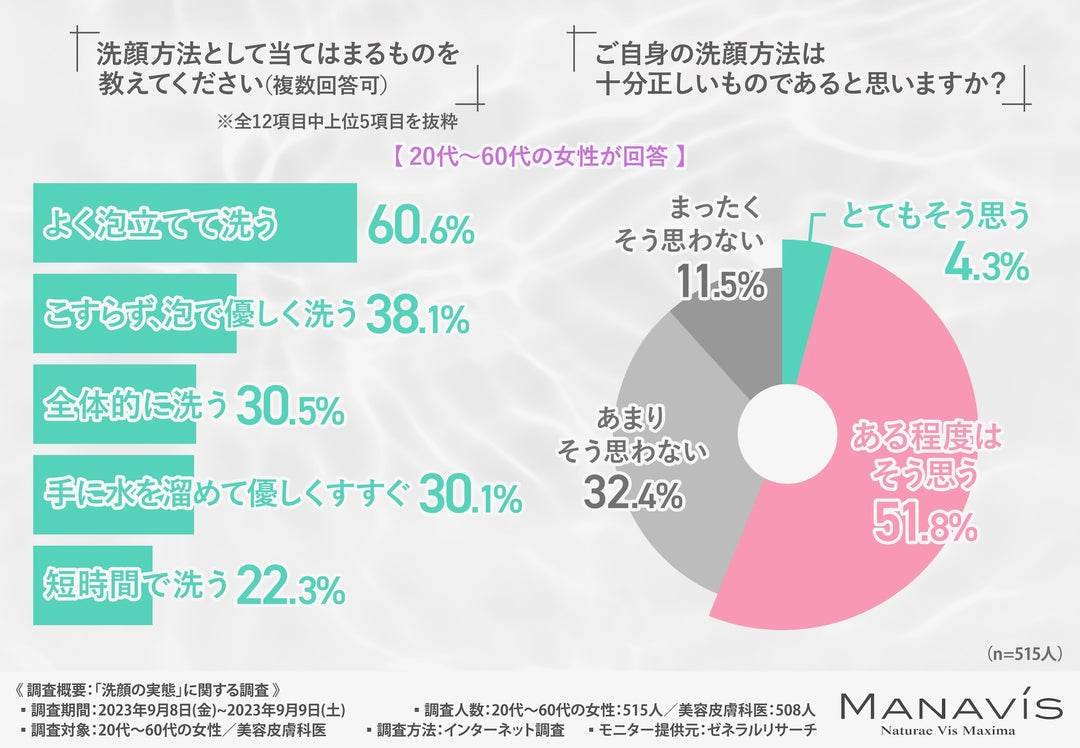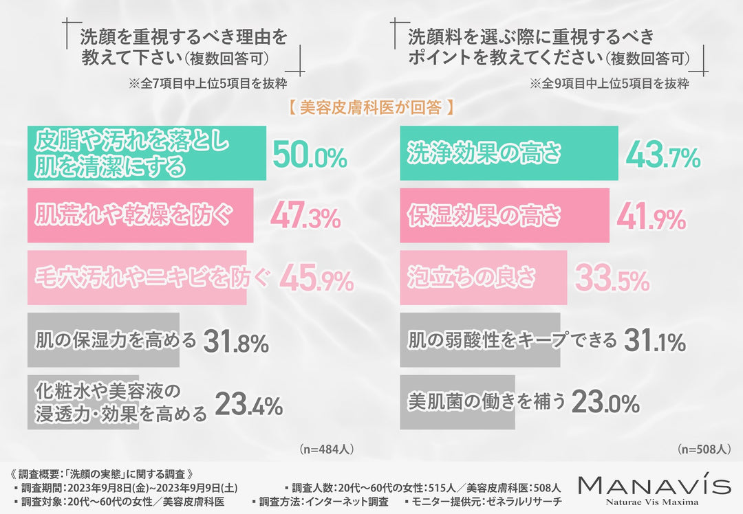 今回の調査で、20代~60代女性の洗顔に関する意識と美容皮膚科医の考えが明らかになりました。
