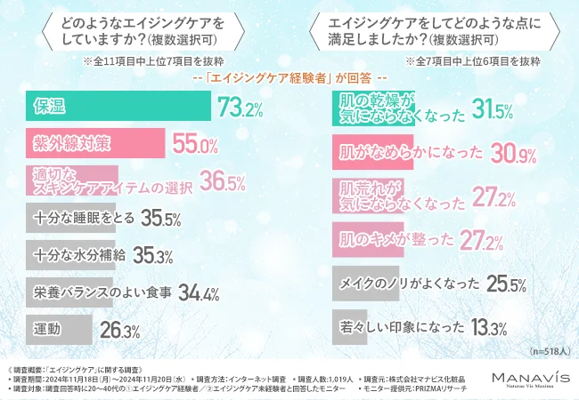 エイジングケア経験者は具体的に『保湿(73.2%)』『紫外線対策(55.0%)』『適切なスキンケアアイテムの選択(36.5%)』を重視しているようです。