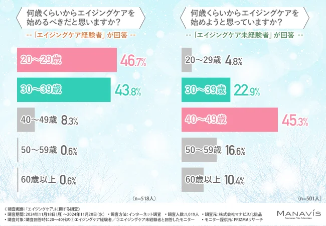 エイジングケアを始める時期について、経験者は20代後半〜30代前半と答える一方、未経験者は40代前後から始めようと考えている方が多いよう。