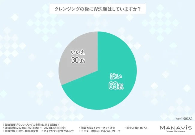 最後に、「クレンジングの後にW洗顔はしていますか?」と質問したところ、約7割の方が『はい(69.1%)』と回答。