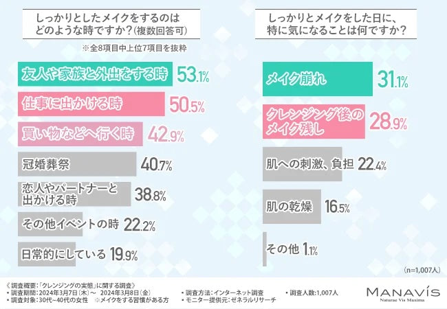 きれいにメイクアップした日だからこそ、メイク崩れやクレンジングの後のメイク残りはとくに気になる悩みポイントのようです。